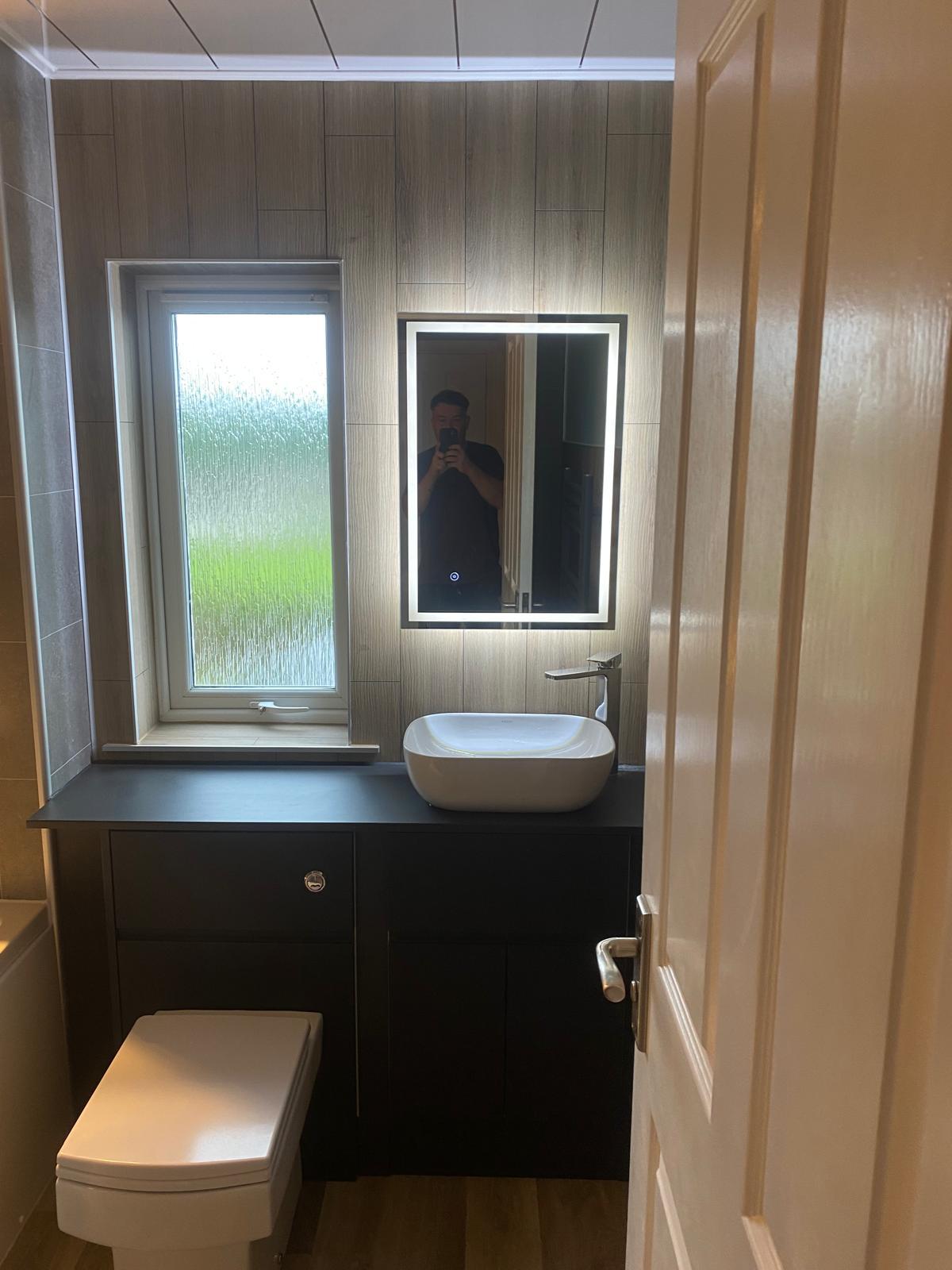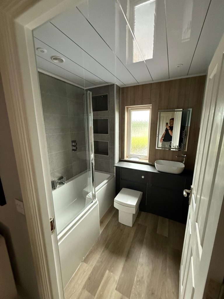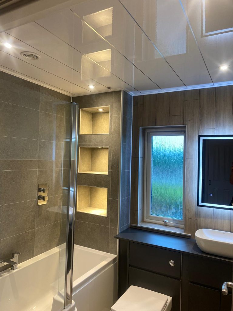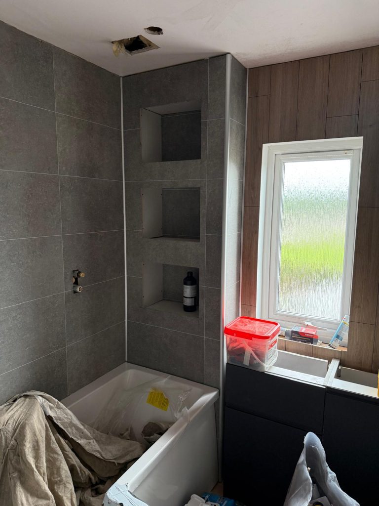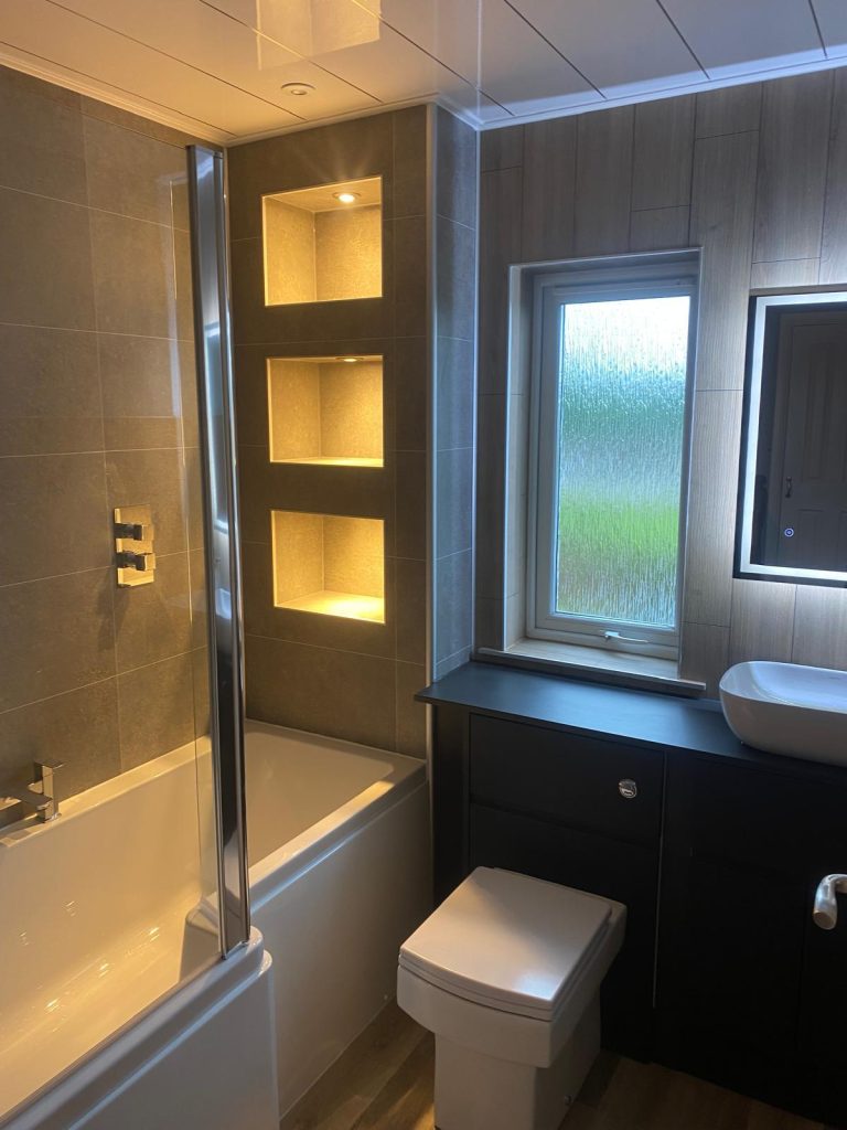 Working closely with our customer, we introduced FIBO wallboarding to modernise the overall look and add a clean, stylish finish. Built in niches were added at the end of the bath to create much needed storage without taking up extra room. To enhance the atmosphere even further, integrated lighting was installed within the niches, giving the space a warm and inviting glow while also being practical for everyday use.