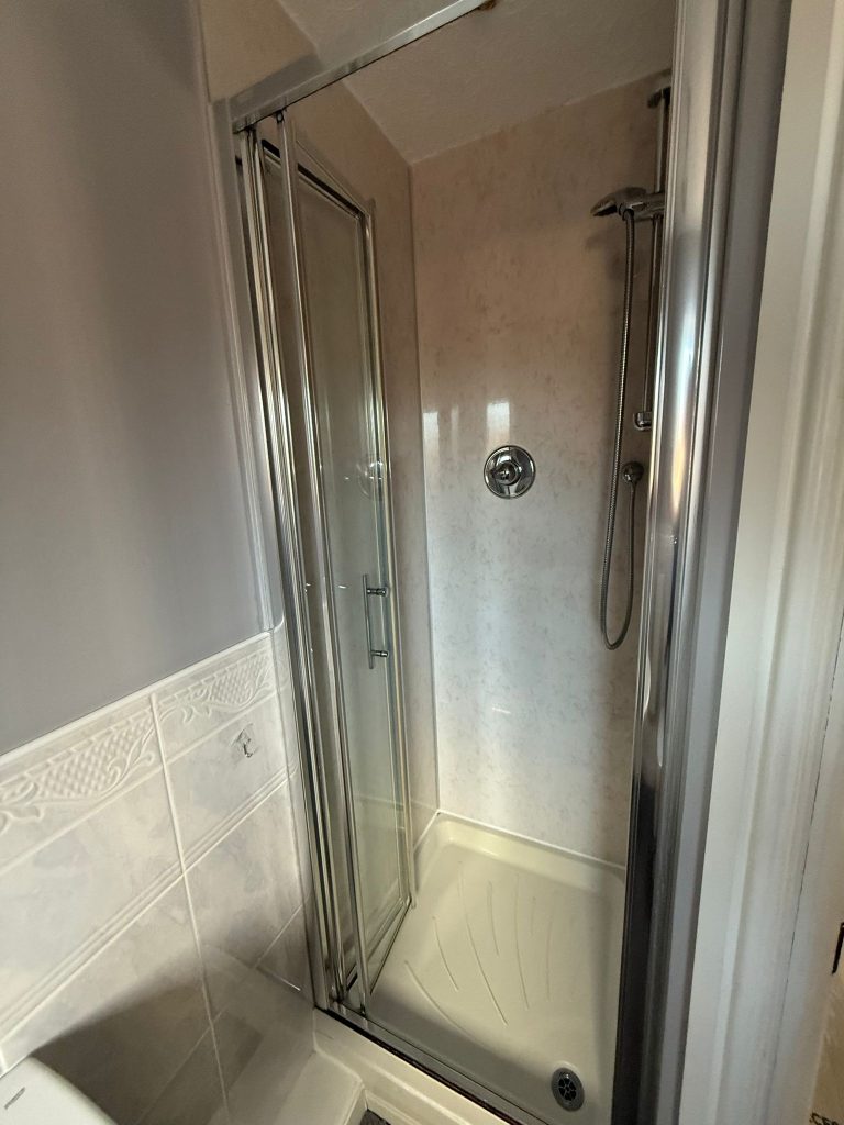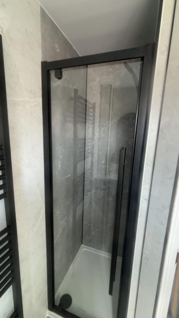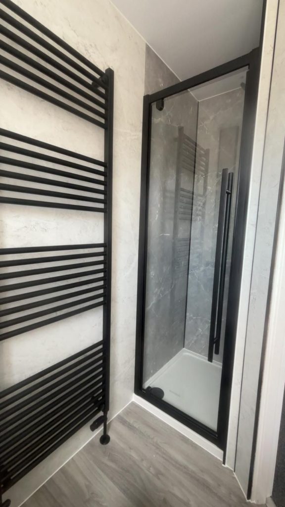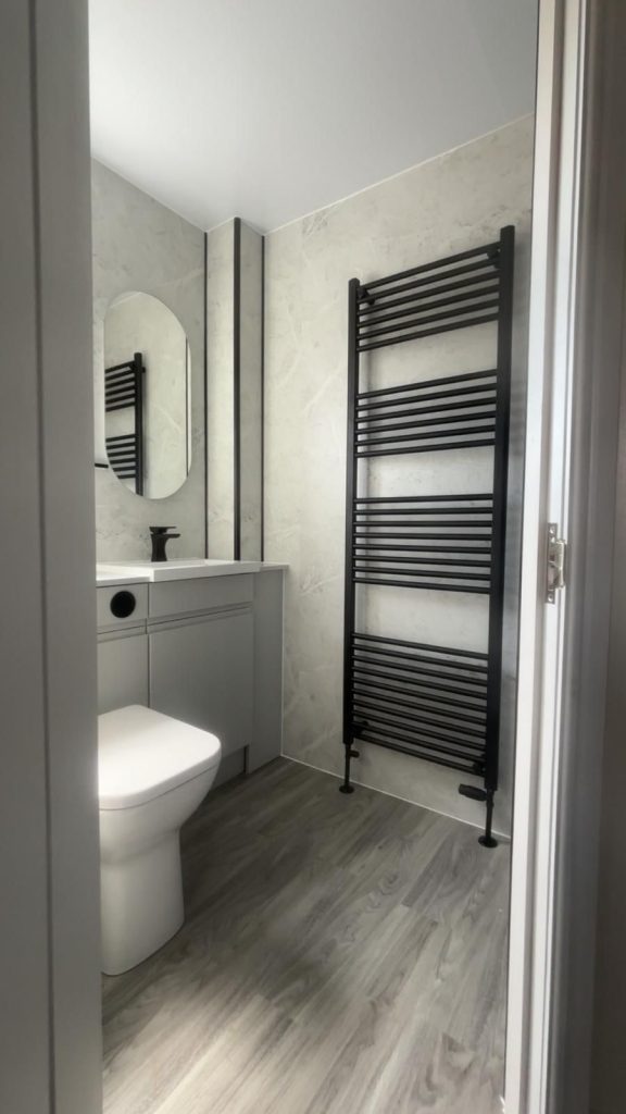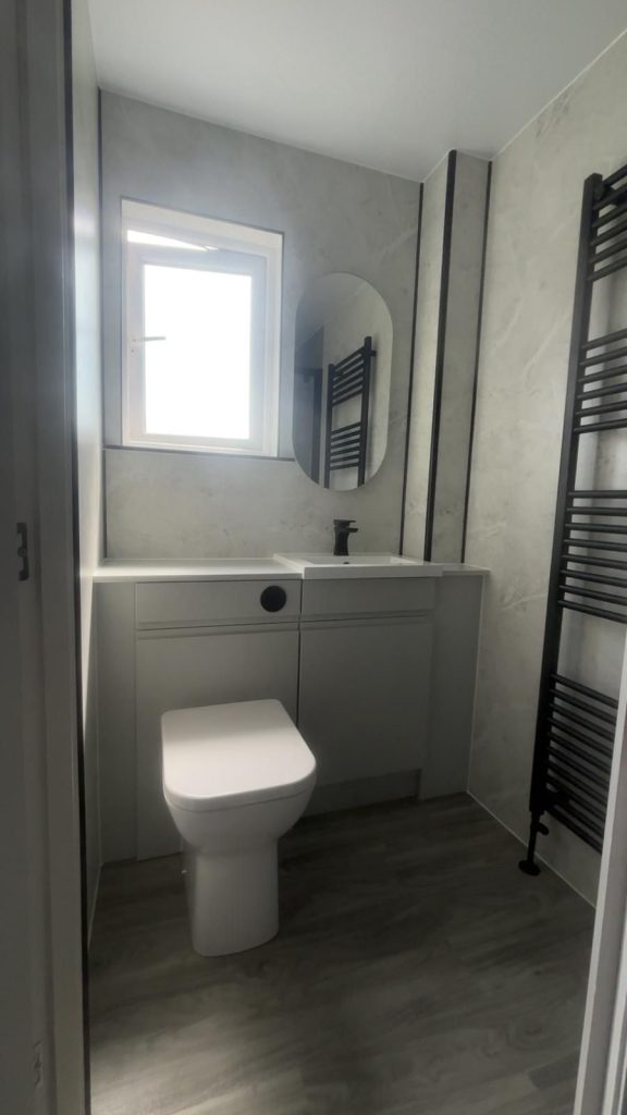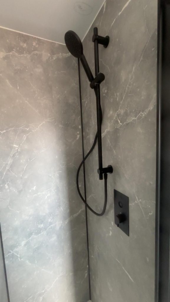 The finished bathroom feels modern confident and well balanced. The black fixtures create a strong visual statement while the wallboarding and flooring complete the look beautifully. Our clients were delighted with the transformation and the way the darker fittings elevate the overall design without making the room feel closed in.