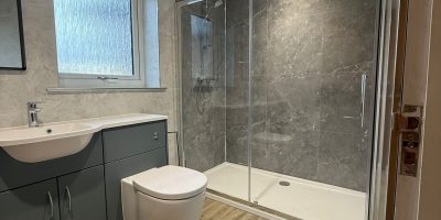 A modern bathroom makeover in Dumfries using FIBO wallboarding, sleek units and Camaro flooring to maximise space and deliver a fresh contemporary finish.