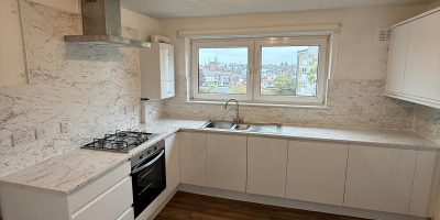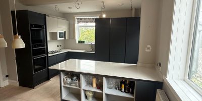 A bright and modern kitchen transformation using Gloss White J Pull doors and 28mm worktops. Designed to flow from the clients previously completed bathroom, this kitchen is now a clean, practical and stylish space.
