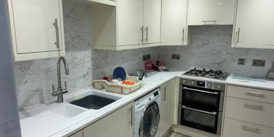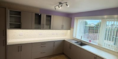 A simple but effective kitchen refresh in Dumfries. New worktops, flooring and a bright plastic ceiling have lifted the entire space, with a white composite sink completing the look perfectly. See how small changes can make a big difference!
