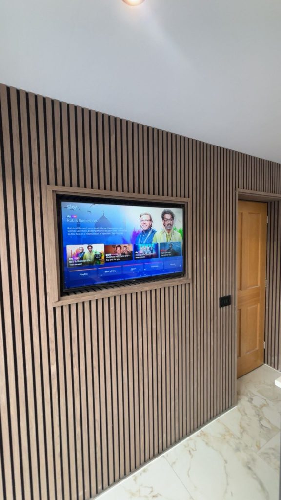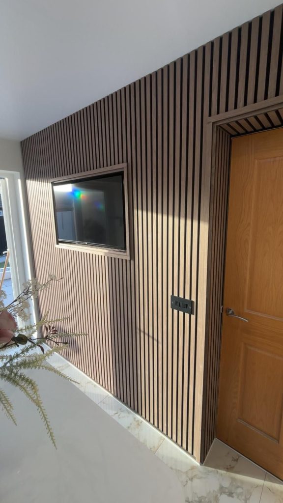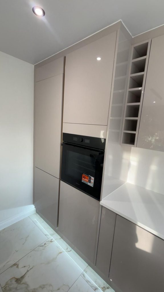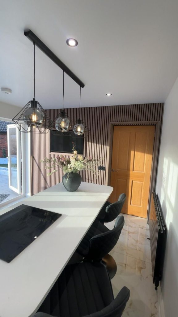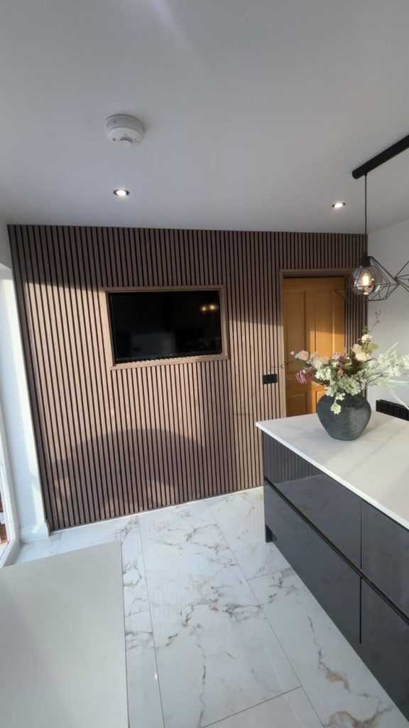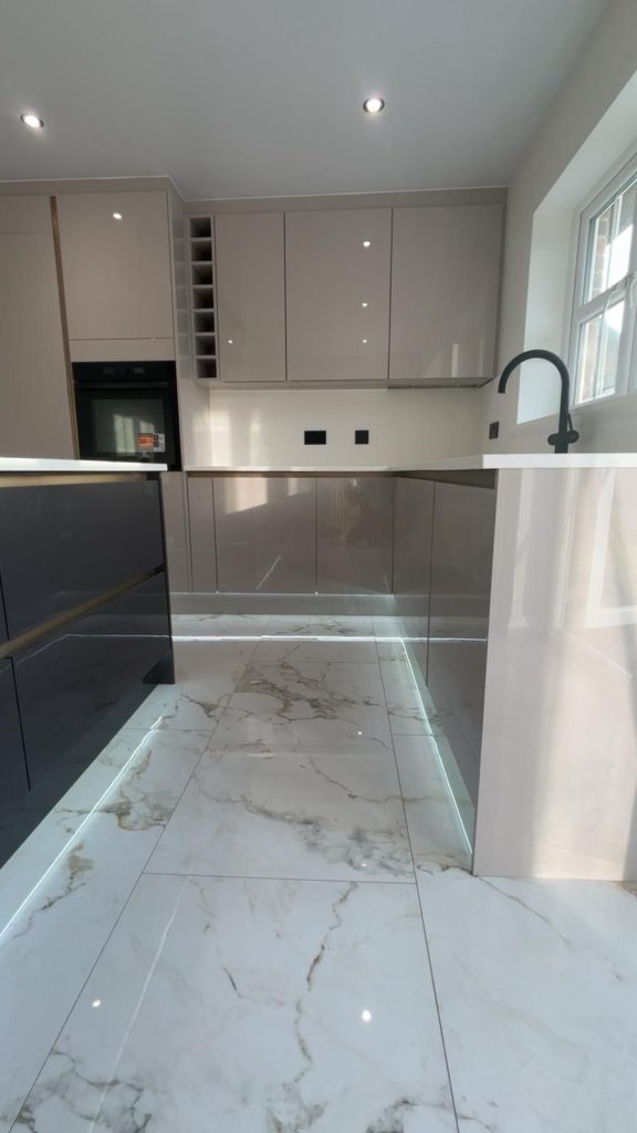 Working closely with the clients, we designed a kitchen that focused on space, flow and a strong modern aesthetic. They chose our popular Mala range in two complementary colours, paired beautifully with a brass metal profile to add warmth and definition. To complete the overall look, a striking nature wall media wall was introduced and finished with large format 1200×600 tiles, giving the space a clean and contemporary feel.