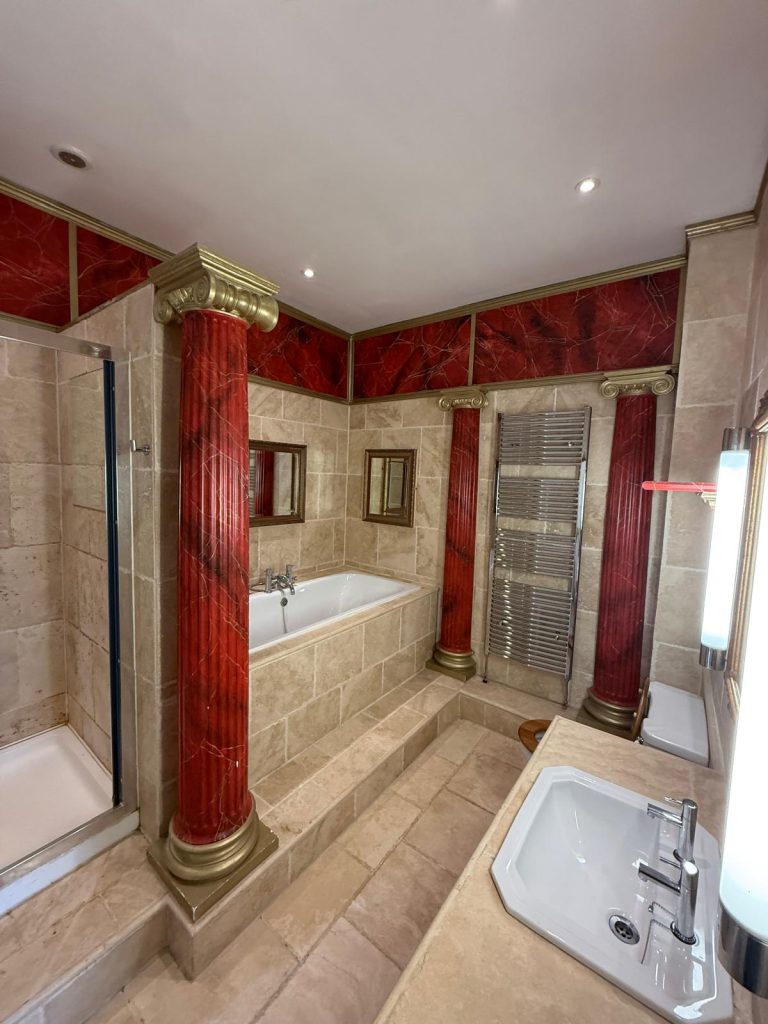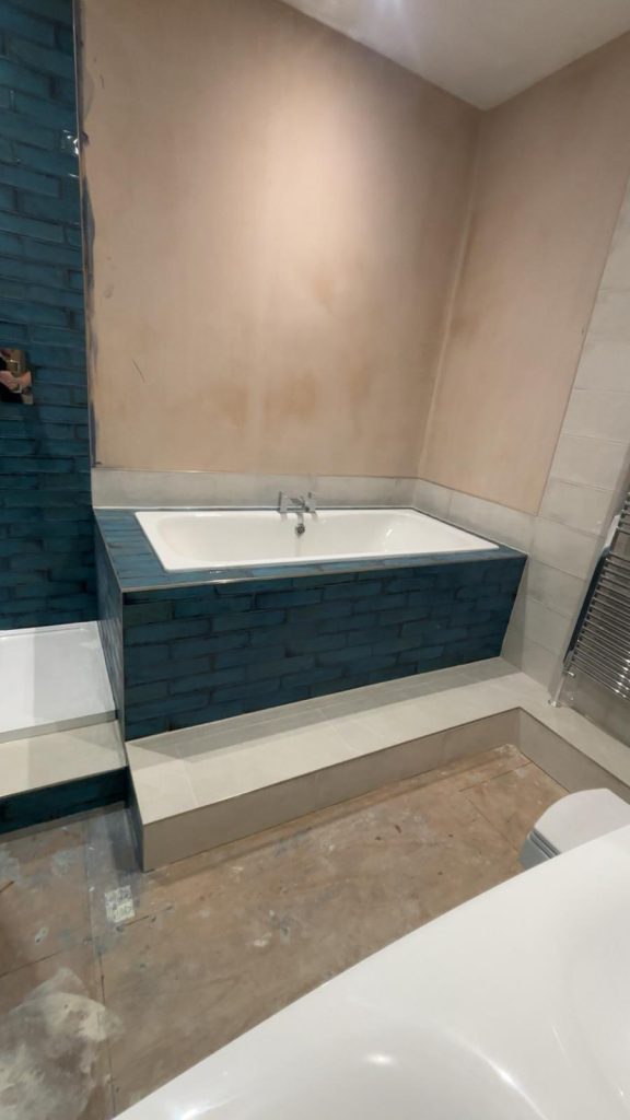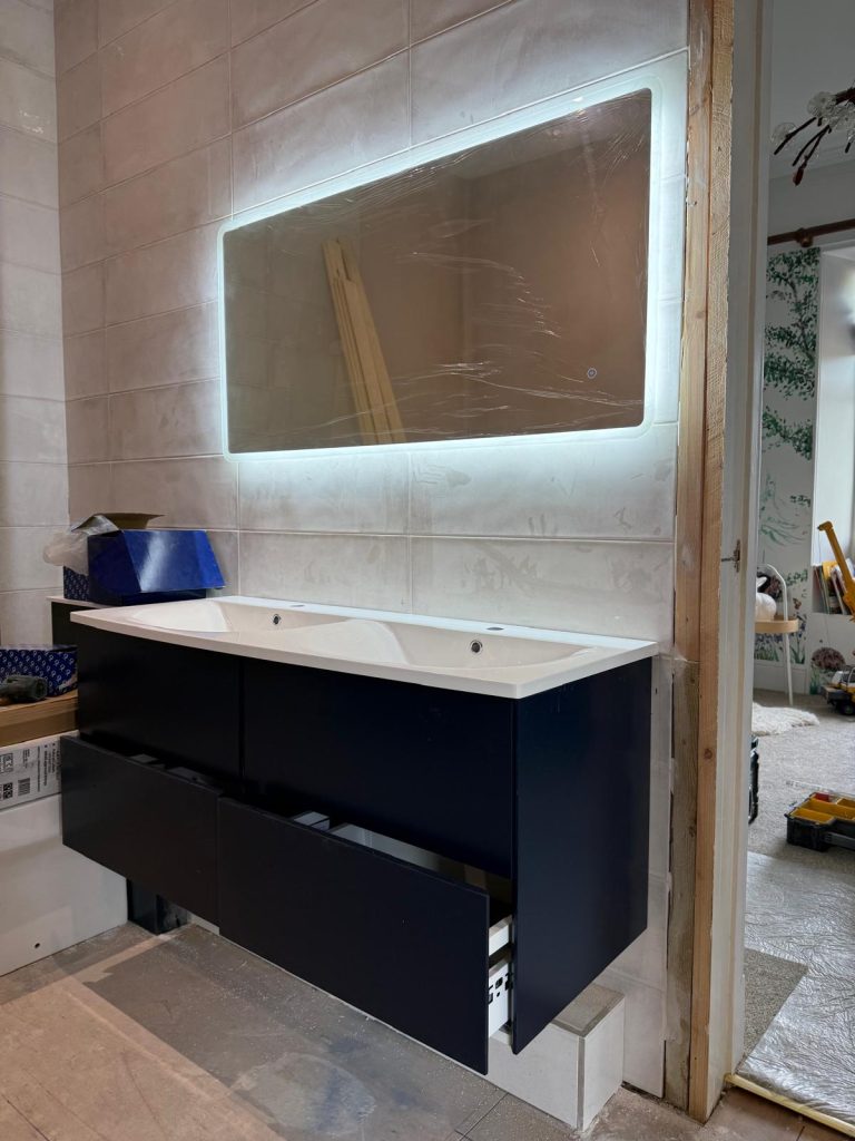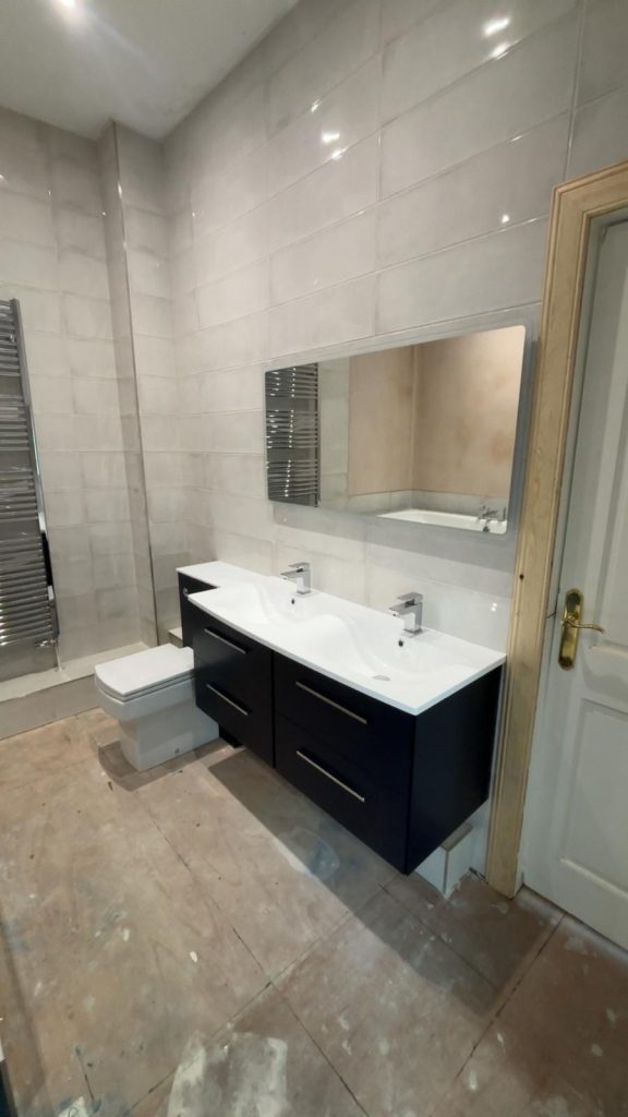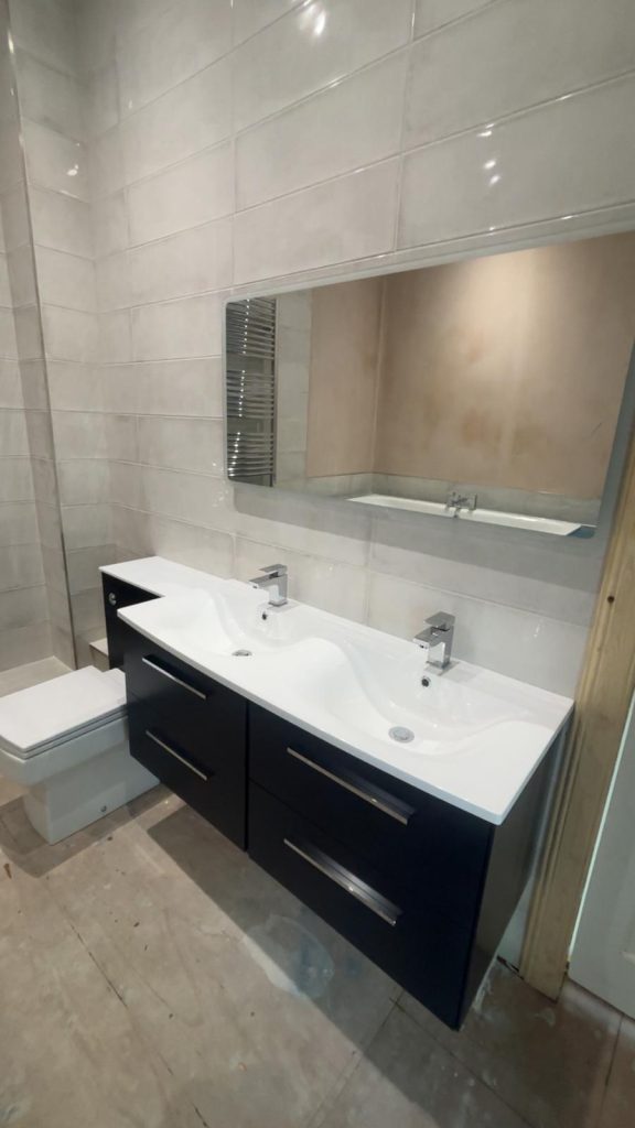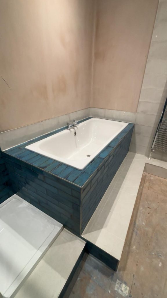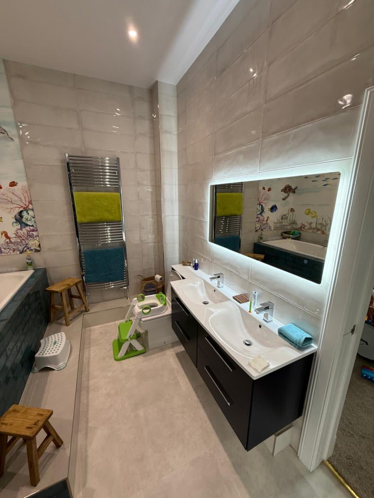 We completely renovated the bathroom, introducing a number of high-quality fixtures and fittings to give the space a fresh new look. A sunk-in bath with steps was installed as a unique feature, paired with stylish wall-hung basins to create a modern, spacious feel. The tiles were designed with a two-tone approach, adding depth and character, while a brand-new shower provided a much-improved bathing experience. To finish, we incorporated playful yet elegant details such as patterned wallpaper and an LED mirror, bringing a perfect blend of functionality and personality to the space.