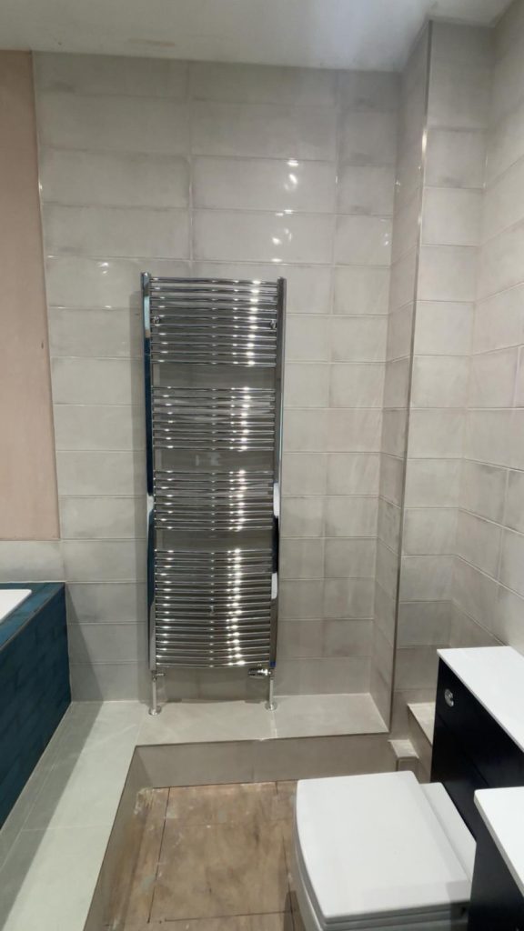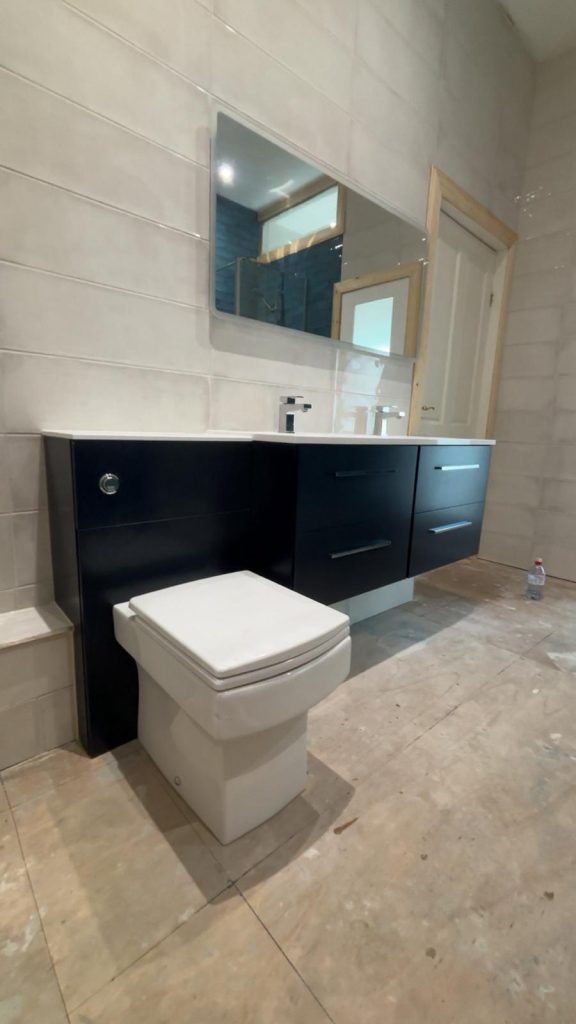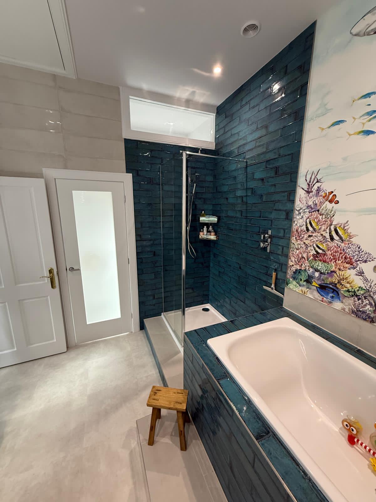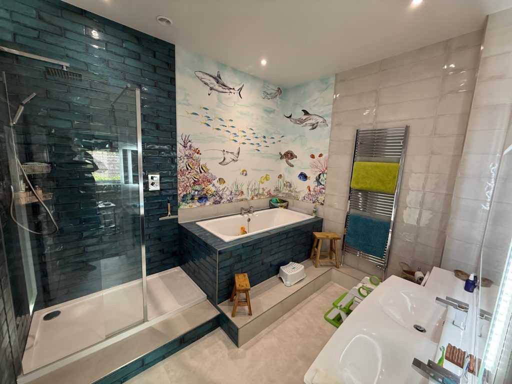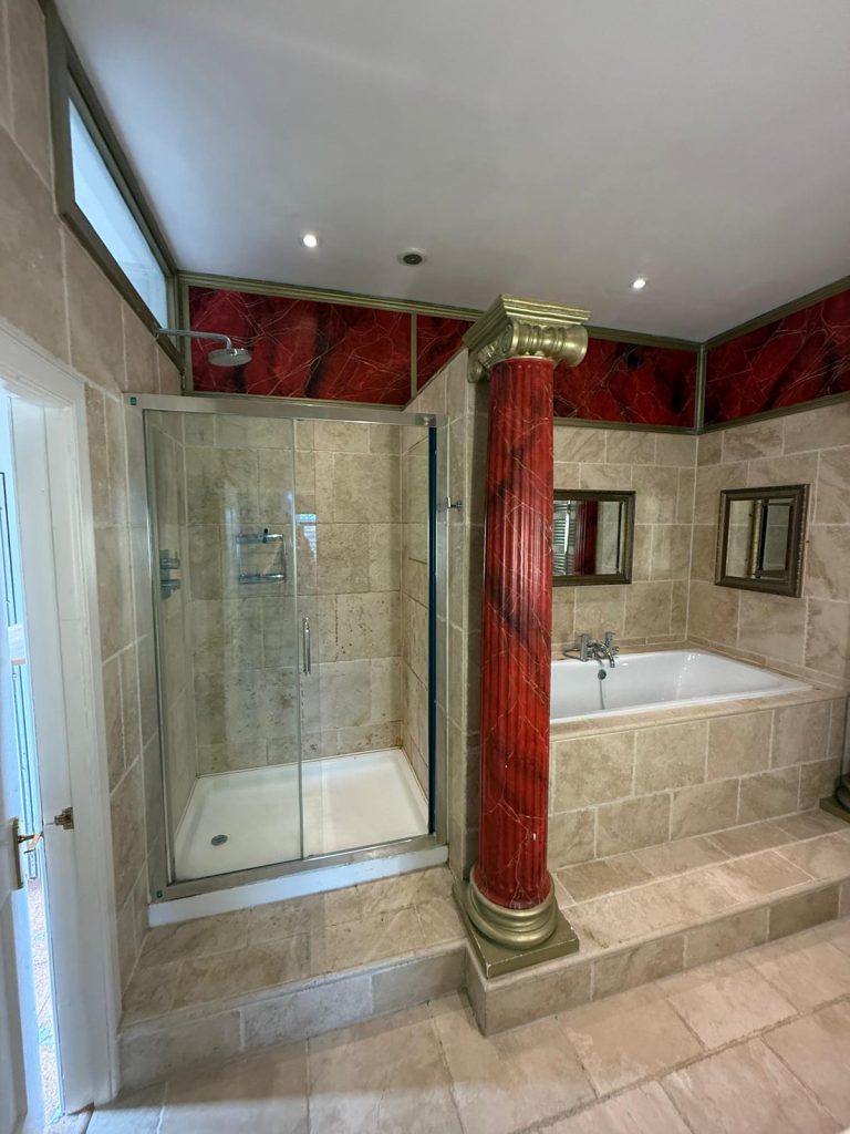 We completely renovated the bathroom, introducing a number of high-quality fixtures and fittings to give the space a fresh new look. A sunk-in bath with steps was installed as a unique feature, paired with stylish wall-hung basins to create a modern, spacious feel. The tiles were designed with a two-tone approach, adding depth and character, while a brand-new shower provided a much-improved bathing experience. To finish, we incorporated playful yet elegant details such as patterned wallpaper and an LED mirror, bringing a perfect blend of functionality and personality to the space.