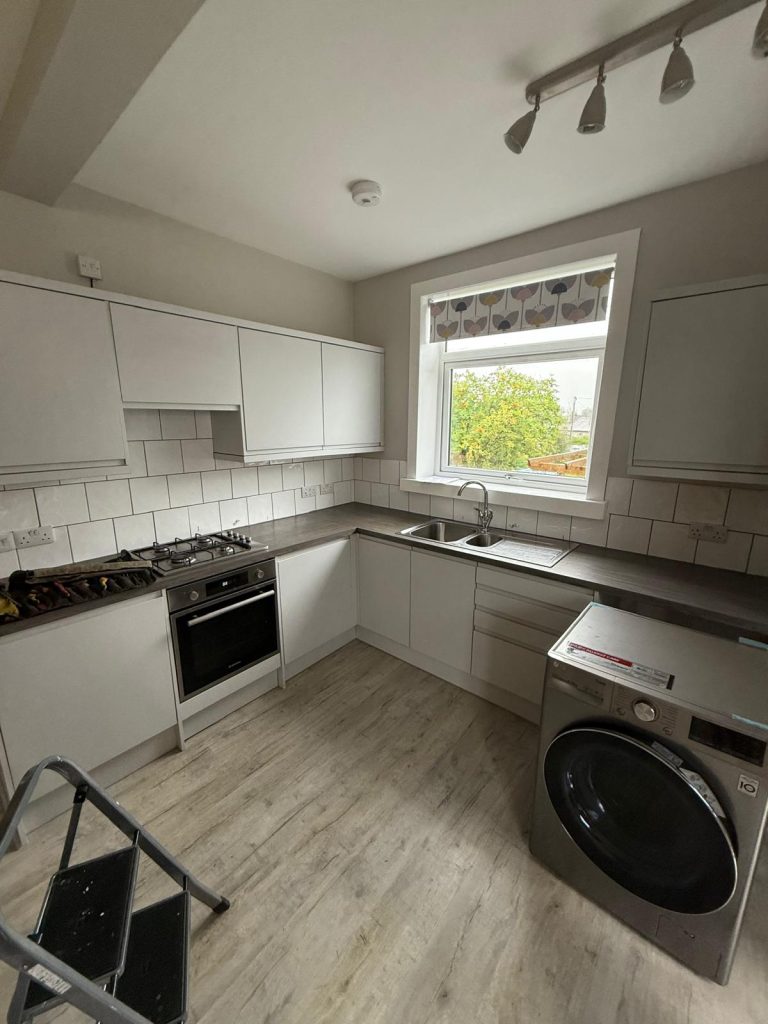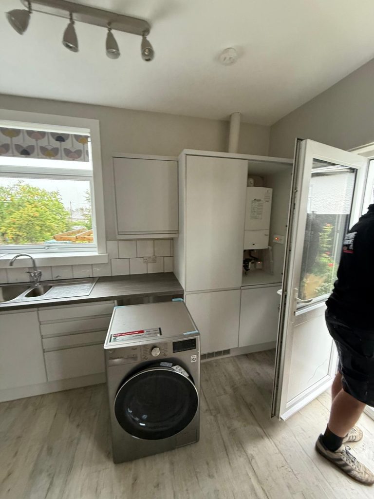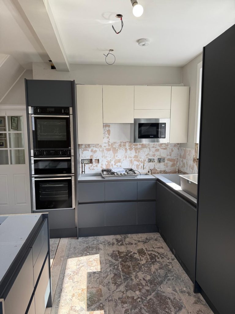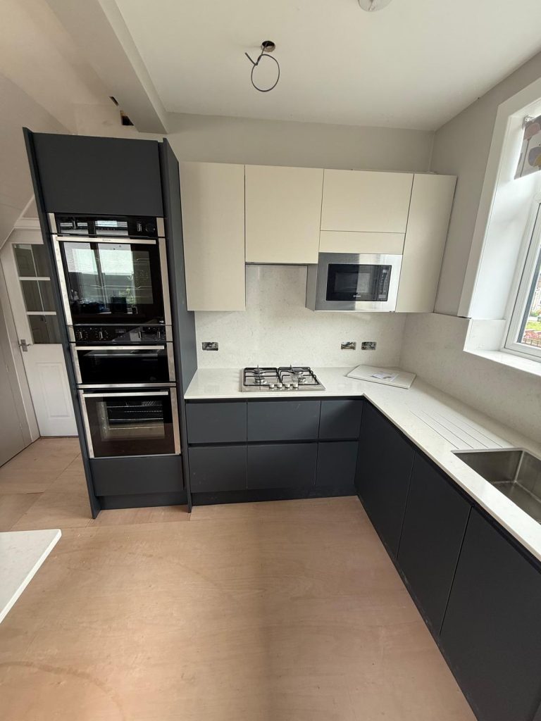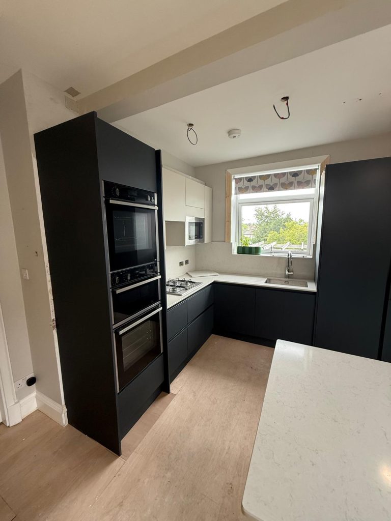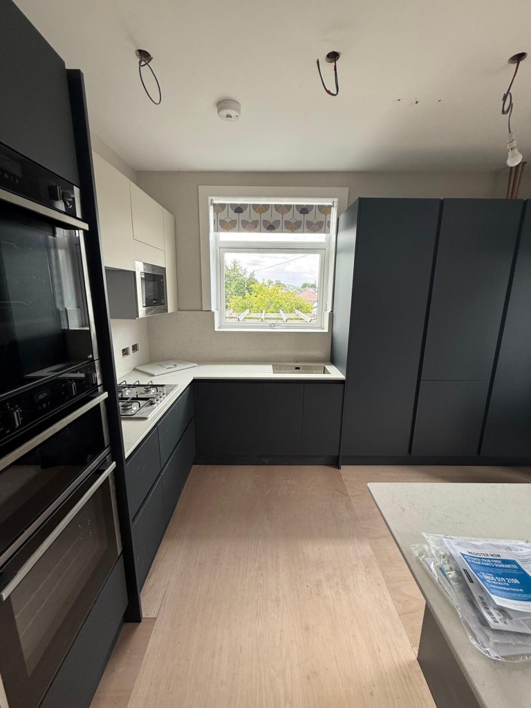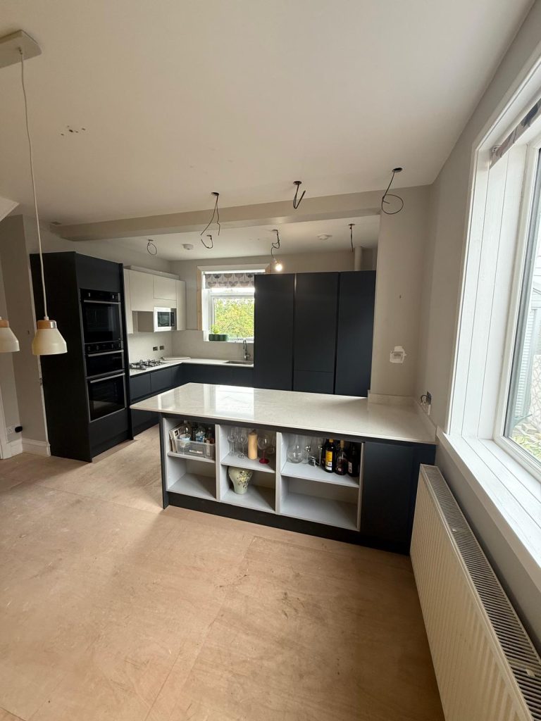 A space tower was introduced to give structured and accessible storage along with a peninsula to create much needed seating and additional worktop space. This transformed how the room flowed and provided clear zones for cooking, storage and socialising. Every choice was made to maximise comfort and functionality while keeping the design clean and modern.