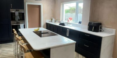 Our biggest job of the year so far was a stunning kitchen and dining room transformation where we opened up the space by removing a structural wall, installed a new Indigo Blue Shaker kitchen with Minerva worktops, and laid herringbone flooring throughout.