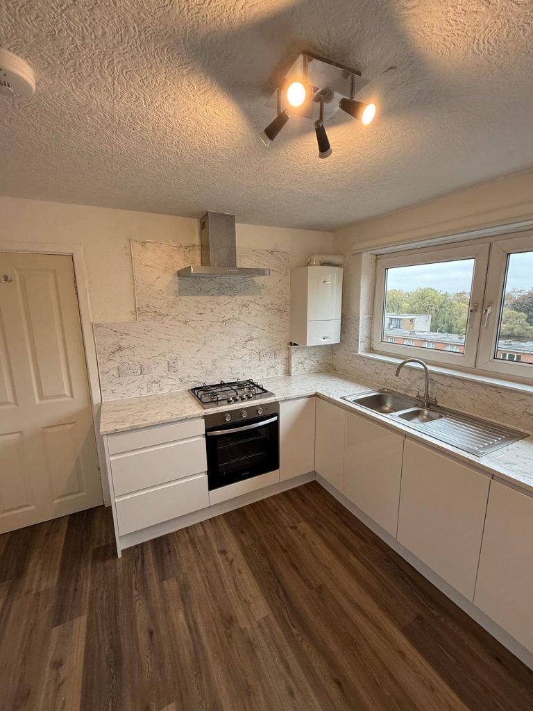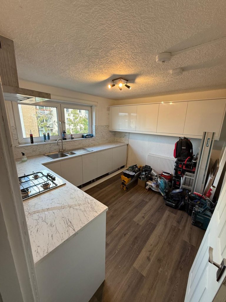 A bright and modern kitchen transformation using Gloss White J Pull doors and 28mm worktops. Designed to flow from the clients previously completed bathroom, this kitchen is now a clean, practical and stylish space.